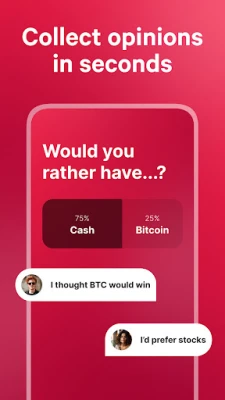 Answer new surveys every day in over 20 categories, such as current topics, politics, or sports, and see what others think. Get hundreds of answers to your anonymous polls in just a few minutes. Level up, compete with the community, earn money and gift cards, or donate to social projects. Try now!