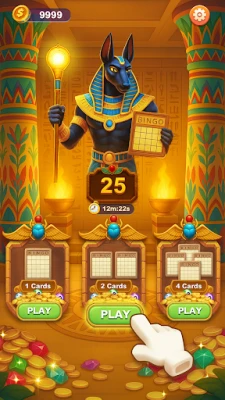 Choose one or multiple Bingo cards before each round, then tap to mark the numbers as they’re called. Complete Bingo tasks to score big wins, unlock exciting spin wheels and scratch cards, and discover even more surprises as you progress. Collect your rewards and continue your journey through the treasure-filled world of ancient Egypt!