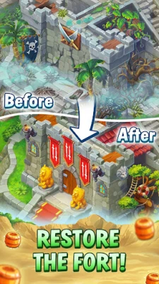 Roofs, towers, stairs – the to-do list is long! Earn precious pearls while blasting through thousands of match-3 levels. Use them to pick out chandeliers and cannons as well as decide what style of gallows you prefer on your pirate paradise island. Unlock the hidden parts of the island, expand the fort, restore the parks and gardens and turn this pirate destination into the envy of the Caribbean!